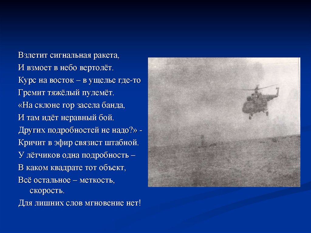 Взлетит сигнальная ракета,И взмоет в небо вертолёт.