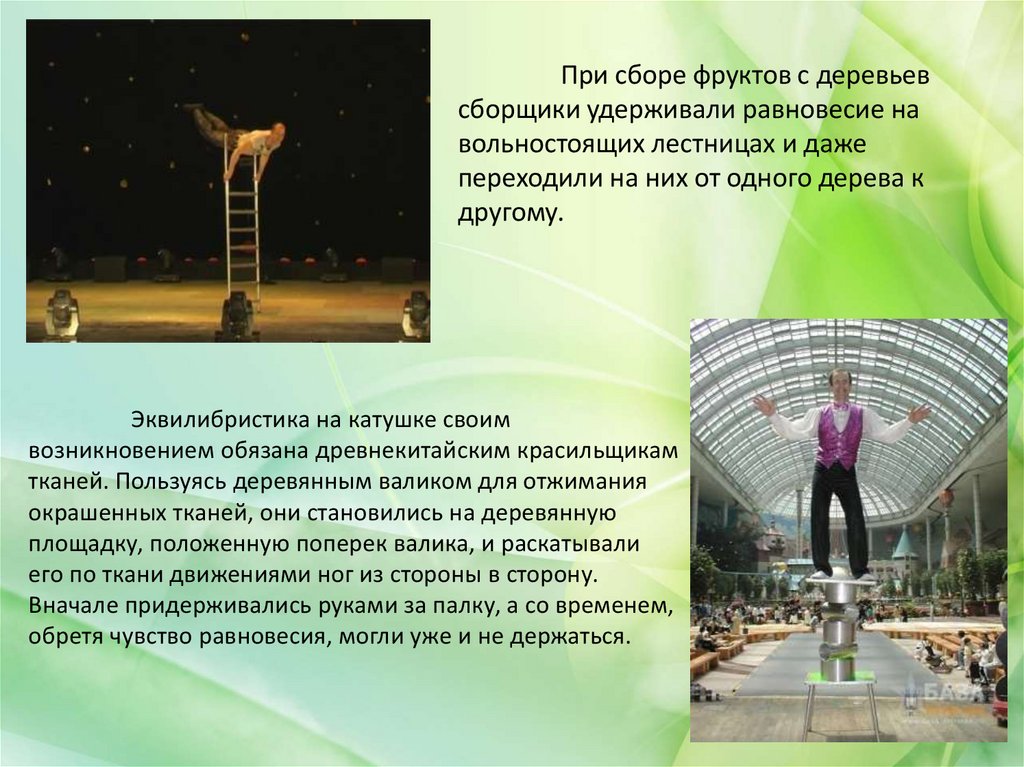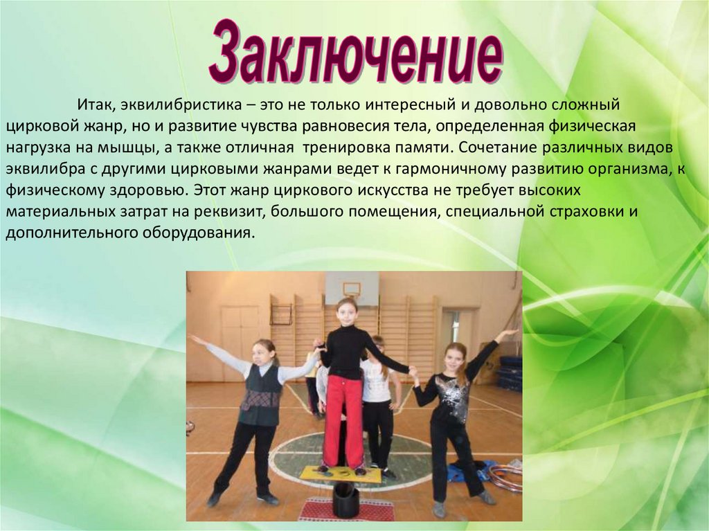 Итак, эквилибристика – это не только интересный и довольно сложныйцирковой жанр, но и развитие чувства равновесия тела, определенная физическая