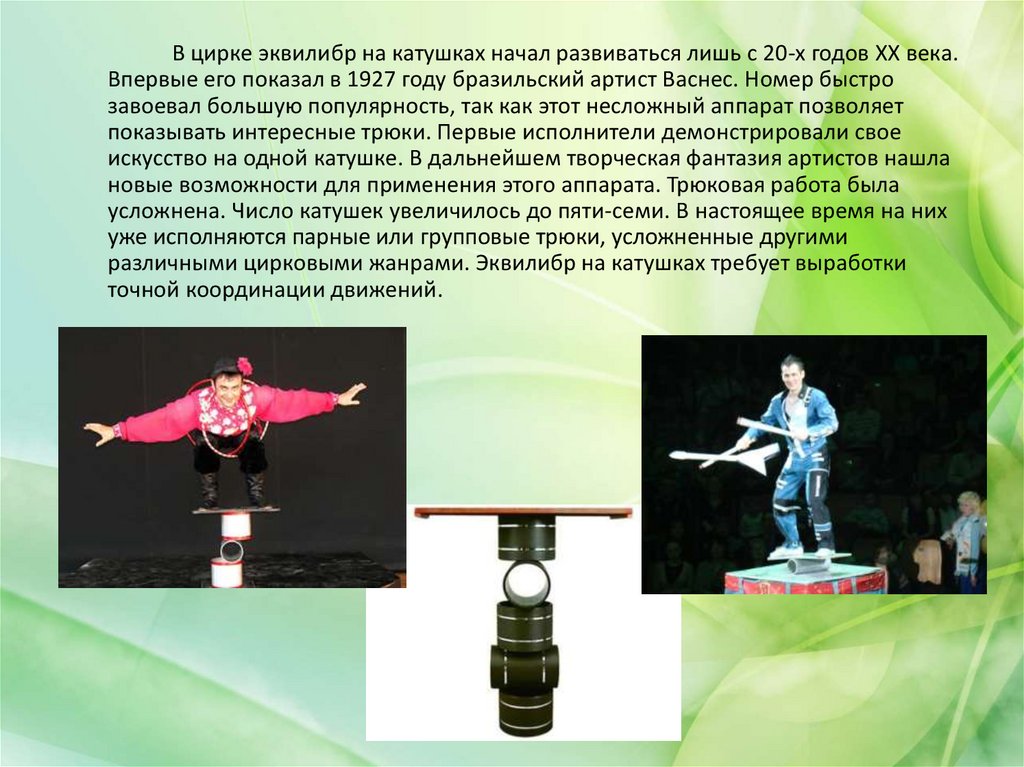 различными цирковыми жанрами. Эквилибр на катушках требует выработки