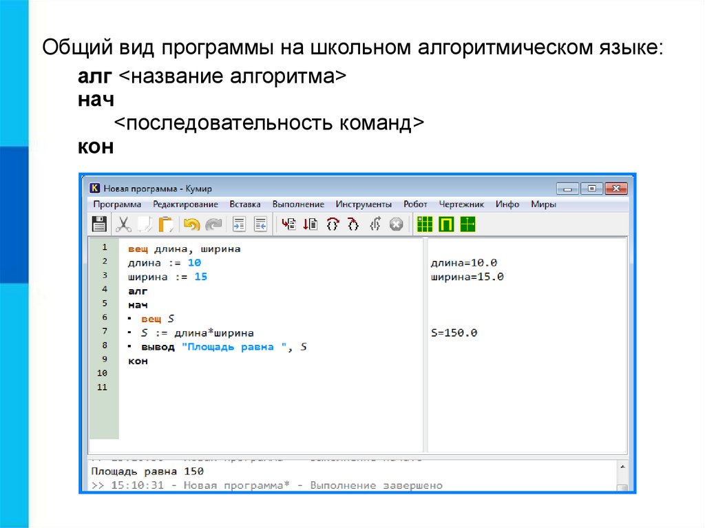 Общий вид программы на школьном алгоритмическом языке:алг <название алгоритма>