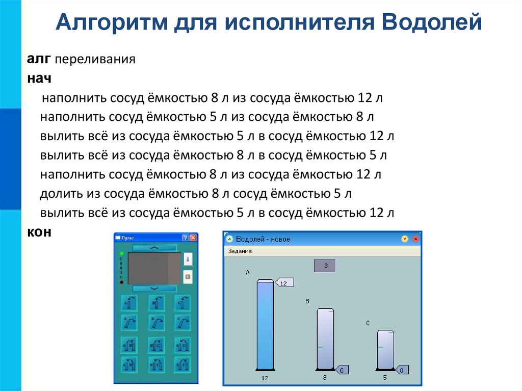 Алгоритм для исполнителя Водолейалг переливания