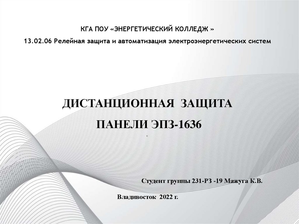 1. КГА ПОУ «ЭНЕРГЕТИЧЕСКИЙ КОЛЛЕДЖ » 13.02.06 Релейная защита и автоматизация электроэнергетических систем ДИСТАНЦИОННАЯ ЗАЩИТА