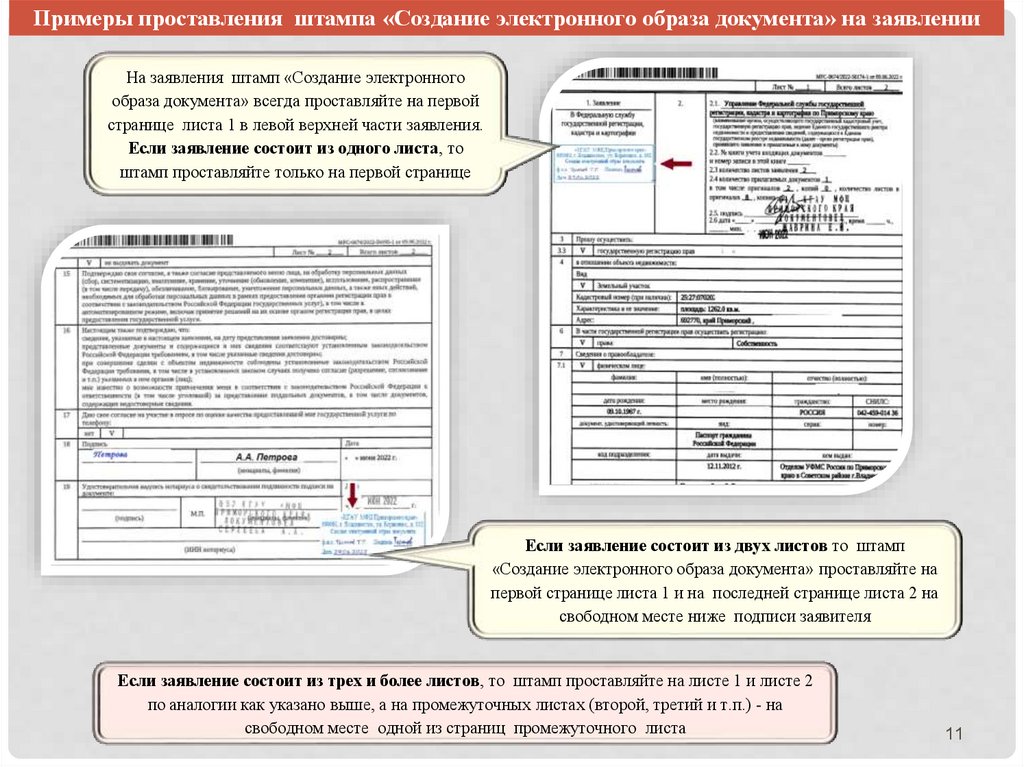 Примеры проставления штампа «Создание электронного образа документа» на заявленииНа заявления штамп «Создание электронного
