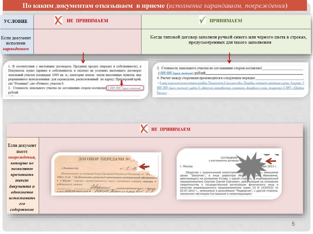 По каким документам отказываем в приеме (исполнение карандашом, повреждения)5