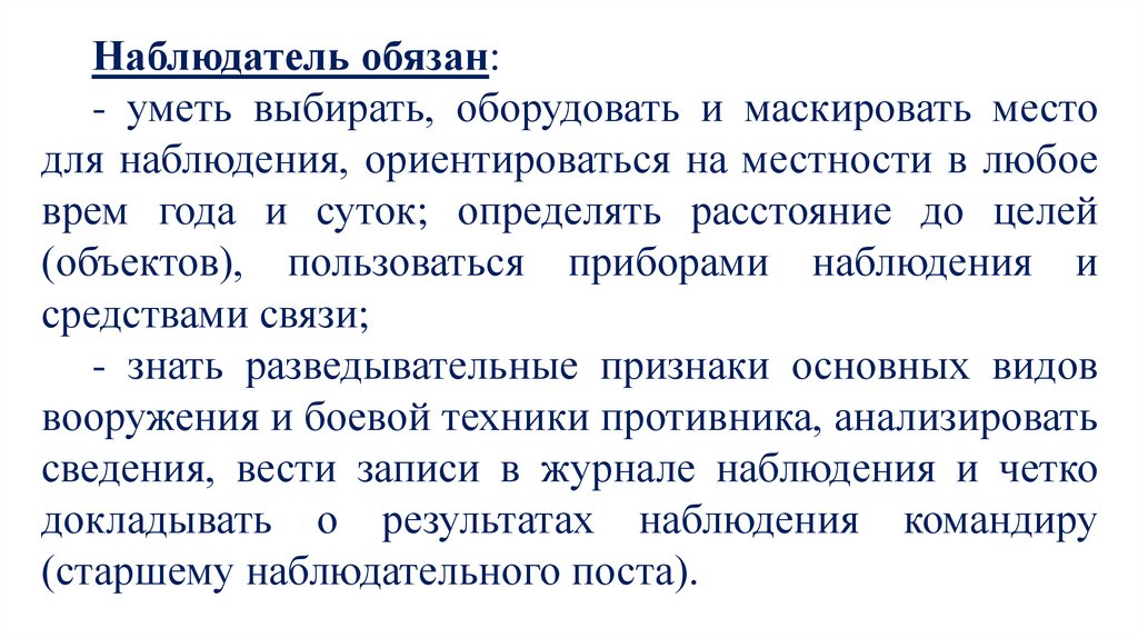 Наблюдатель обязан:- уметь выбирать, оборудовать и маскировать место