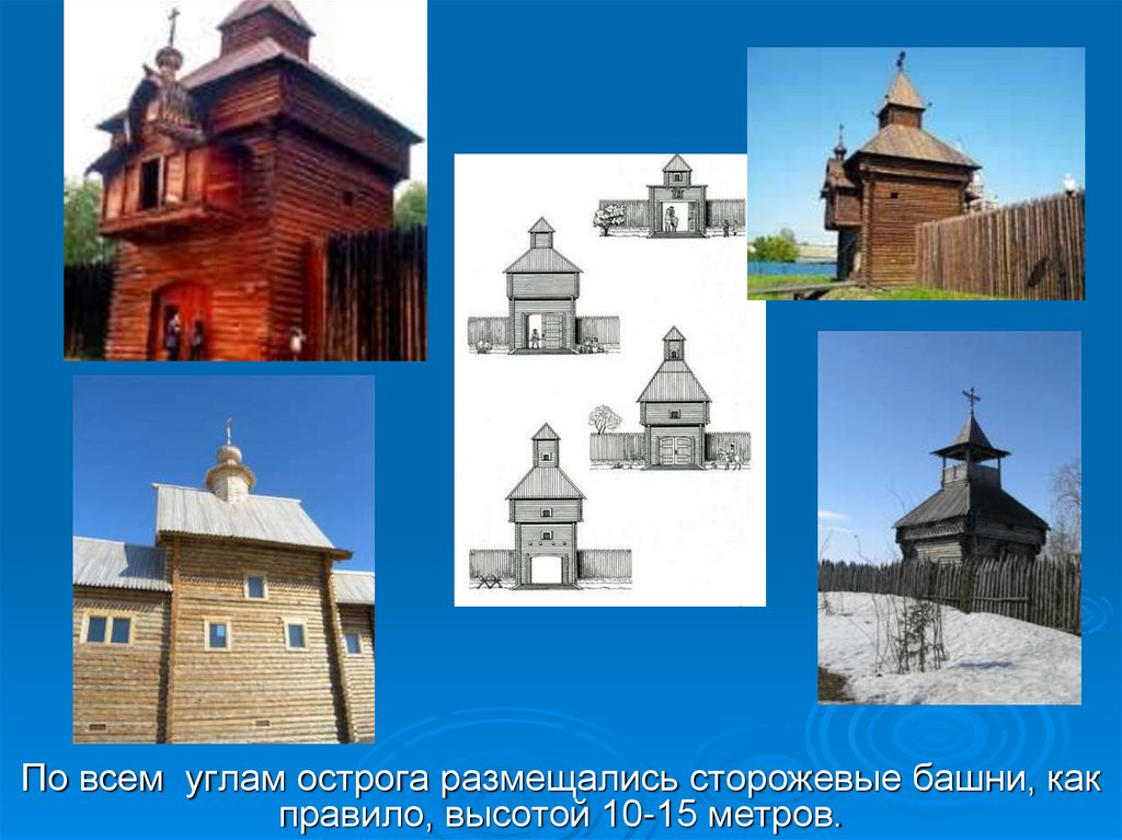 По всем углам острога размещались сторожевые башни, какправило, высотой 10-15 метров.
