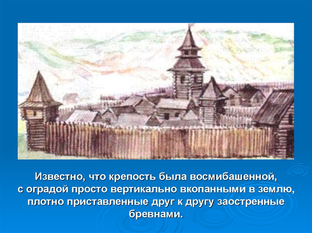 Известно, что крепость была восмибашенной,с оградой просто вертикально вкопанными в землю,