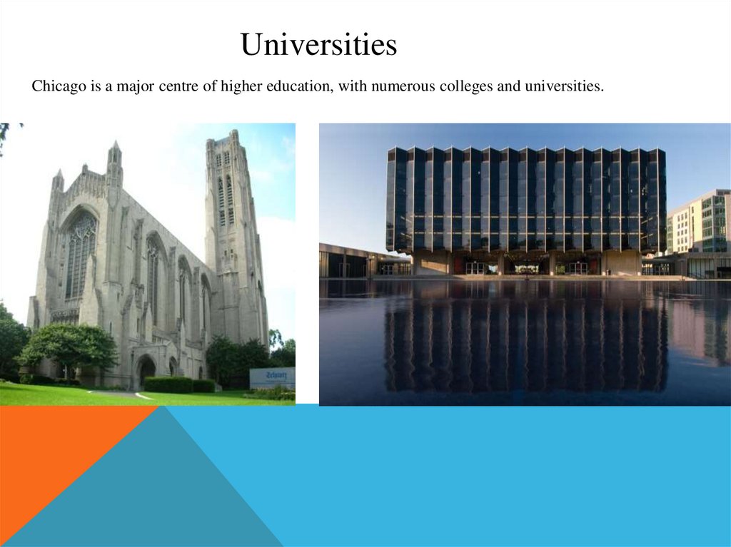 UniversitiesChicago is a major centre of higher education, with numerous colleges and universities.