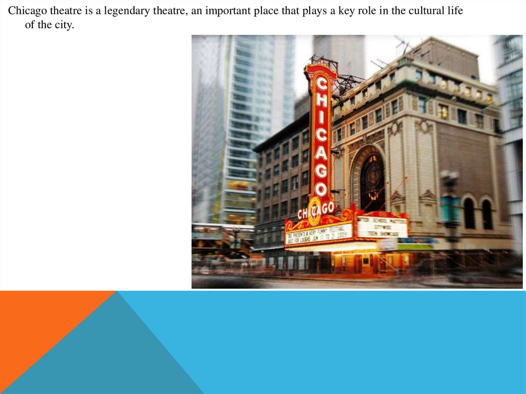 Chicago theatre is a legendary theatre, an important place that plays a key role in the cultural lifeof the city.