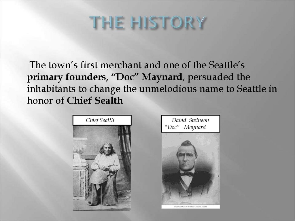 The town’s first merchant and one of the Seattle’sprimary founders, “Doc” Maynard, persuaded the