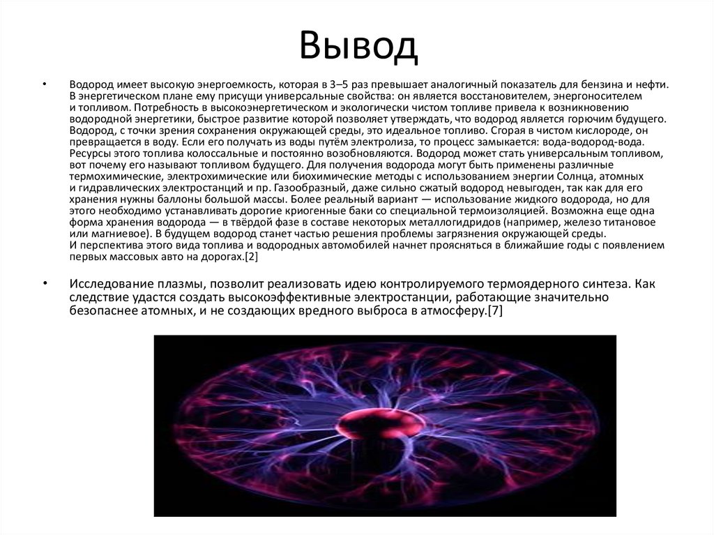 ВыводВодород имеет высокую энергоемкость, которая в 3–5 раз превышает аналогичный показатель для бензина и нефти.