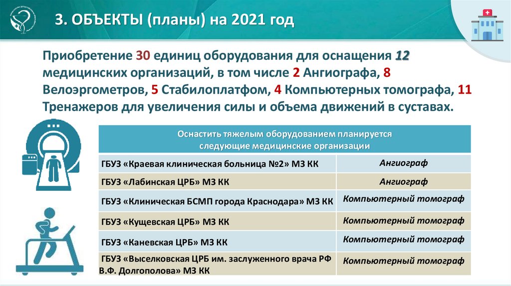 3. ОБЪЕКТЫ (планы) на 2021 годПриобретение 30 единиц оборудования для оснащения 12