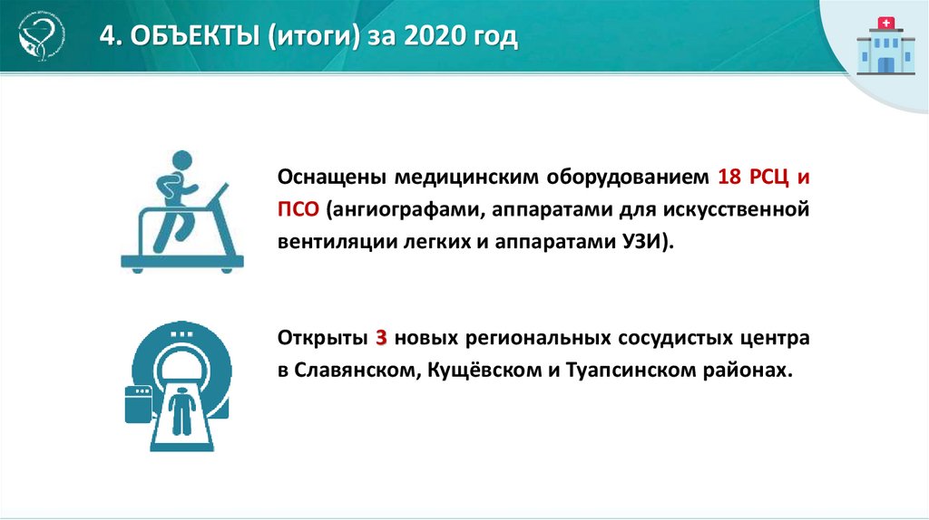 4. ОБЪЕКТЫ (итоги) за 2020 годОснащены медицинским оборудованием 18 РСЦ и
