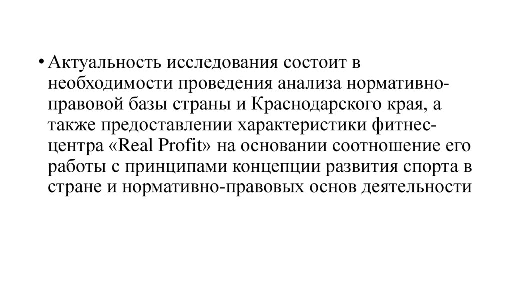 • Актуальность исследования состоит внеобходимости проведения анализа нормативноправовой базы страны и Краснодарского края, а