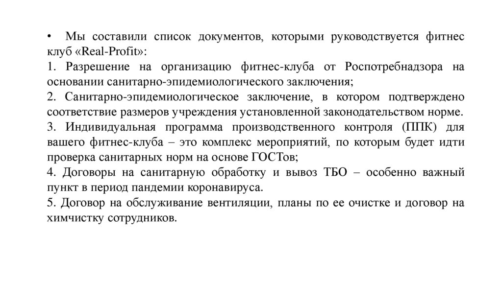 • Мы составили список документов, которыми руководствуется фитнесклуб «Real-Profit»: