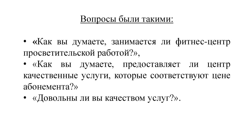 Вопросы были такими:• «Как вы думаете, занимается ли фитнес-центр
