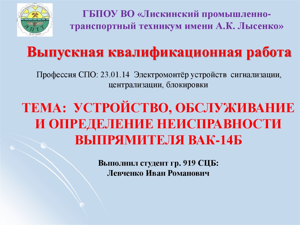 ГБПОУ ВО «Лискинский промышленнотранспортный техникум имени А.К. Лысенко»Выпускная квалификационная работа