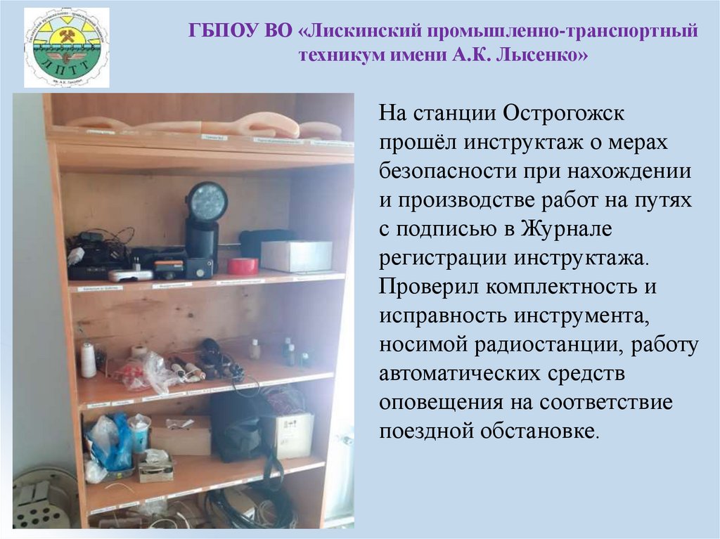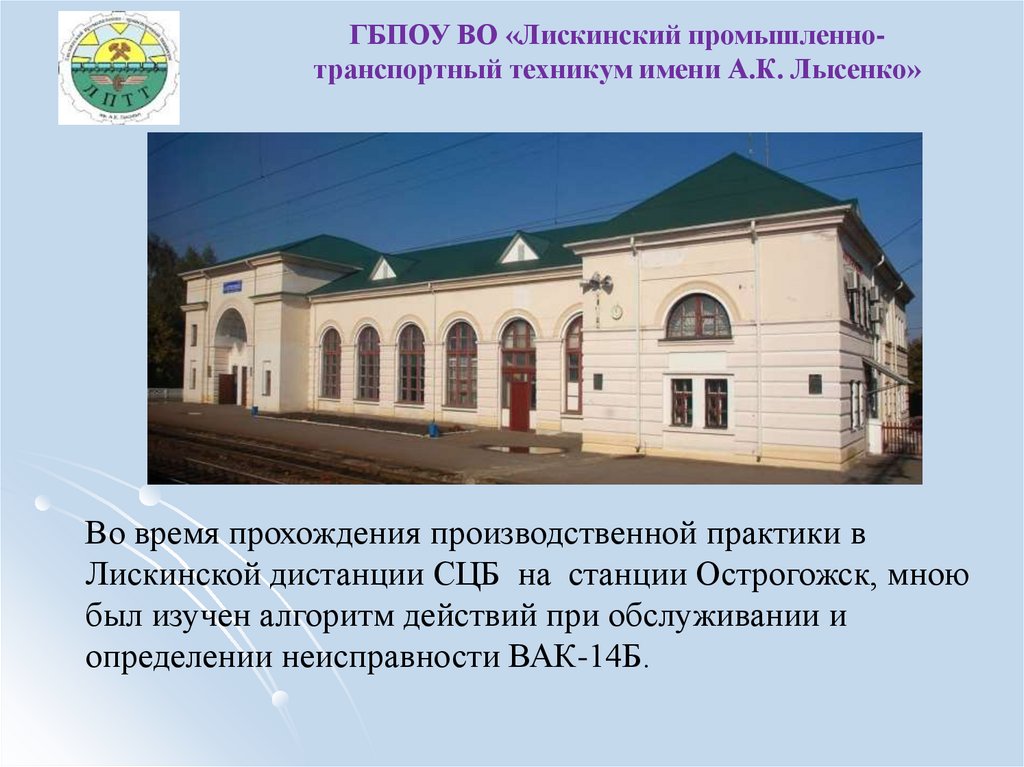 ГБПОУ ВО «Лискинский промышленнотранспортный техникум имени А.К. Лысенко»Во время прохождения производственной практики в