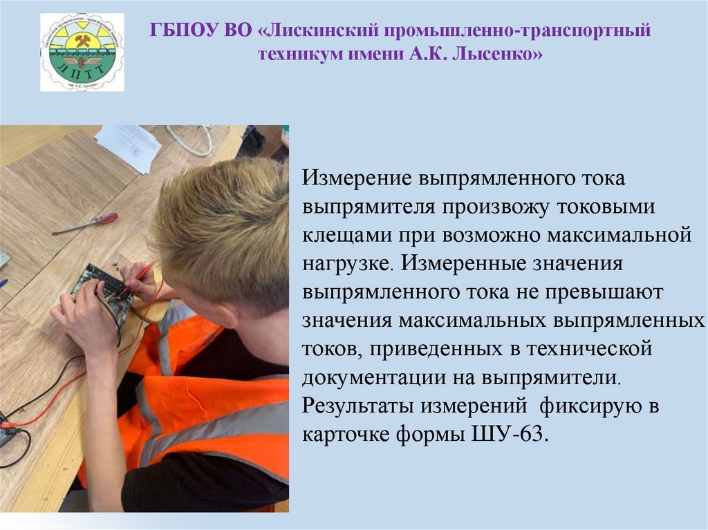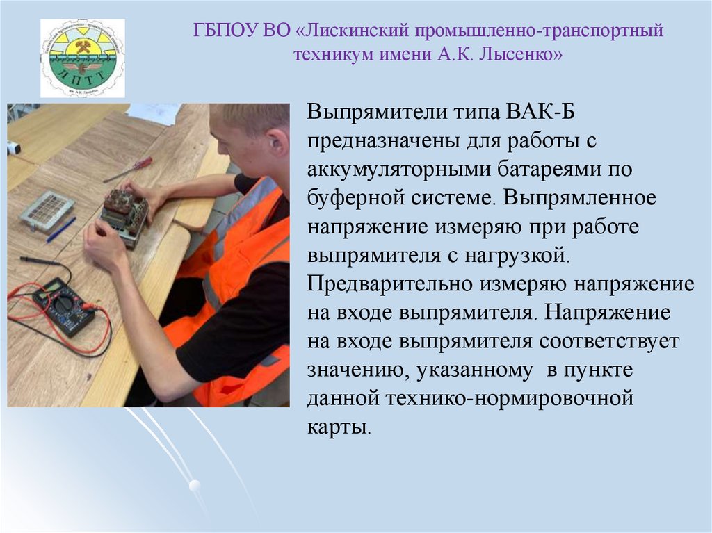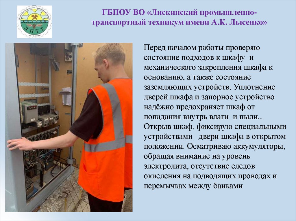 ГБПОУ ВО «Лискинский промышленнотранспортный техникум имени А.К. Лысенко»Перед началом работы проверяю