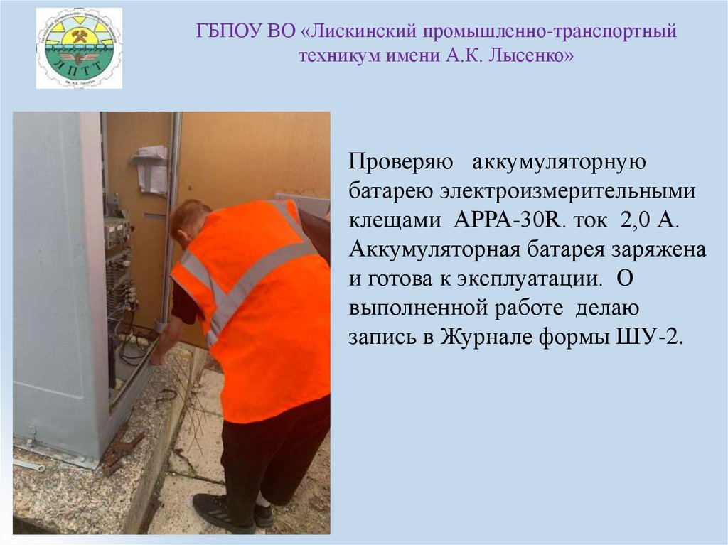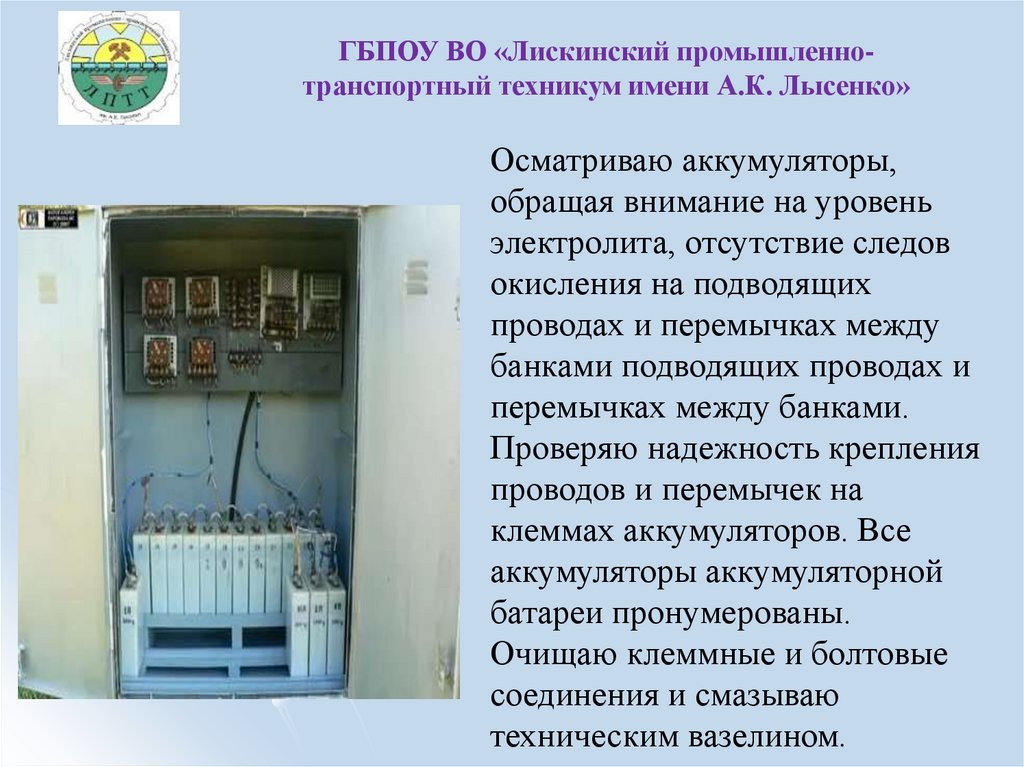 ГБПОУ ВО «Лискинский промышленнотранспортный техникум имени А.К. Лысенко»Осматриваю аккумуляторы,