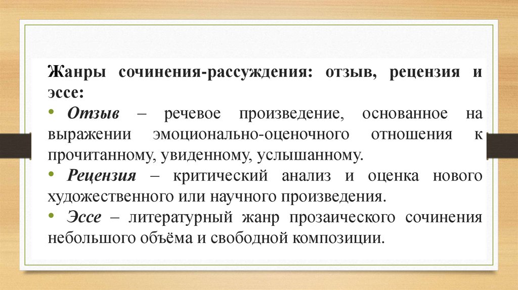 Жанры сочинения-рассуждения: отзыв, рецензия иэссе:
