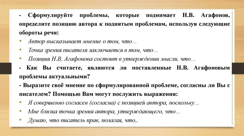 - Сформулируйте проблемы, которые поднимает Н.В. Агафонов,определите позицию автора к поднятым проблемам, используя следующие