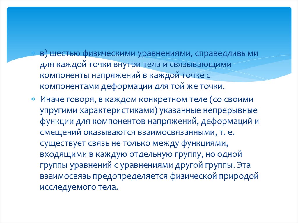 в) шестью физическими уравнениями, справедливымидля каждой точки внутри тела и связывающими