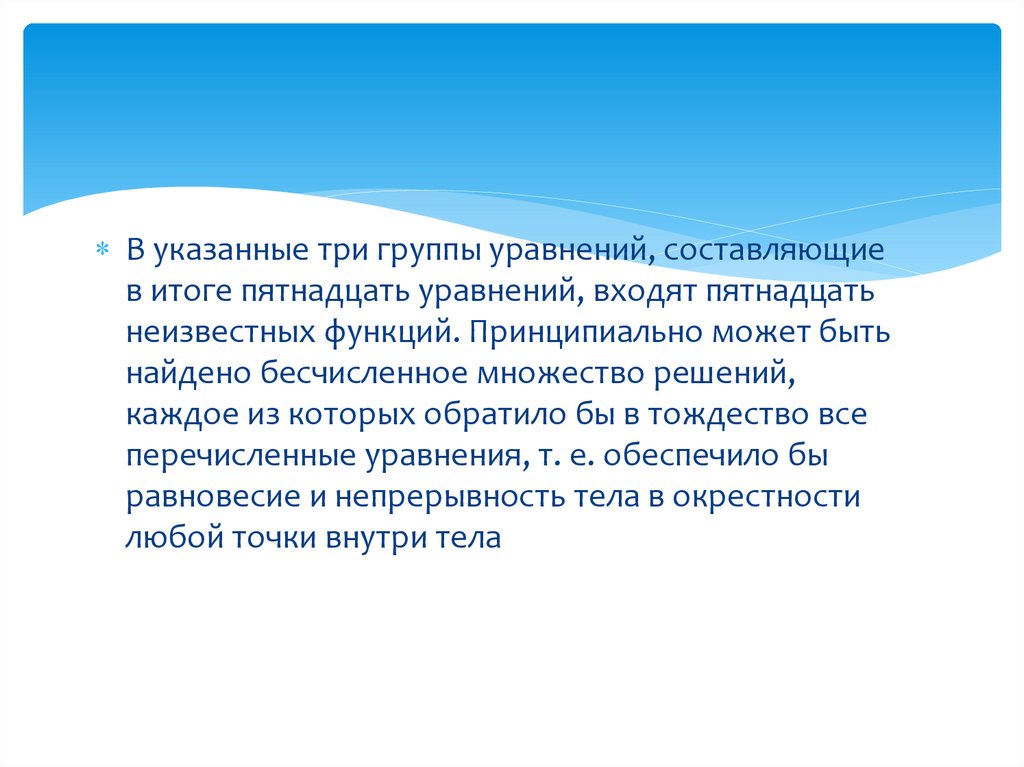 а) тремя статическими, уравнениями,справедливыми для каждой точки внутри тела, из