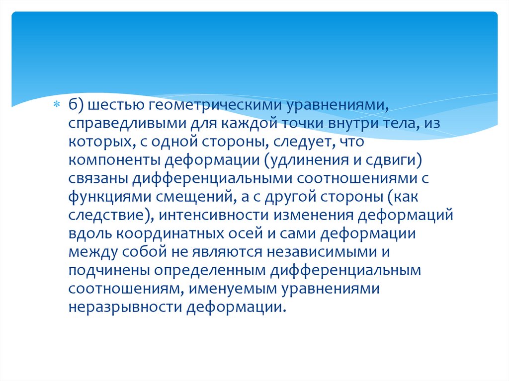б) шестью геометрическими уравнениями,справедливыми для каждой точки внутри тела, из