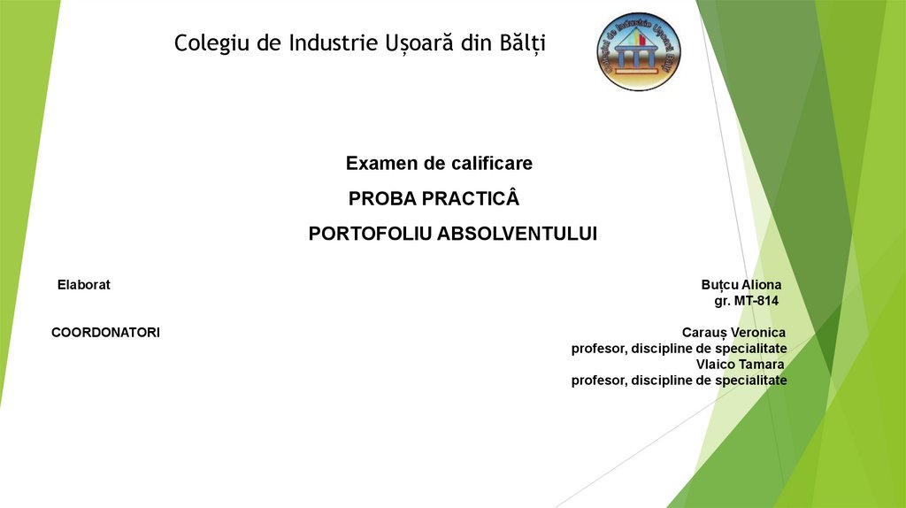 1. Examen de calificare PROBA PRACTICÂ PORTOFOLIU ABSOLVENTULUI Elaborat Buțcu Aliona gr. MT-814 COORDONATORI Carauș Veronica