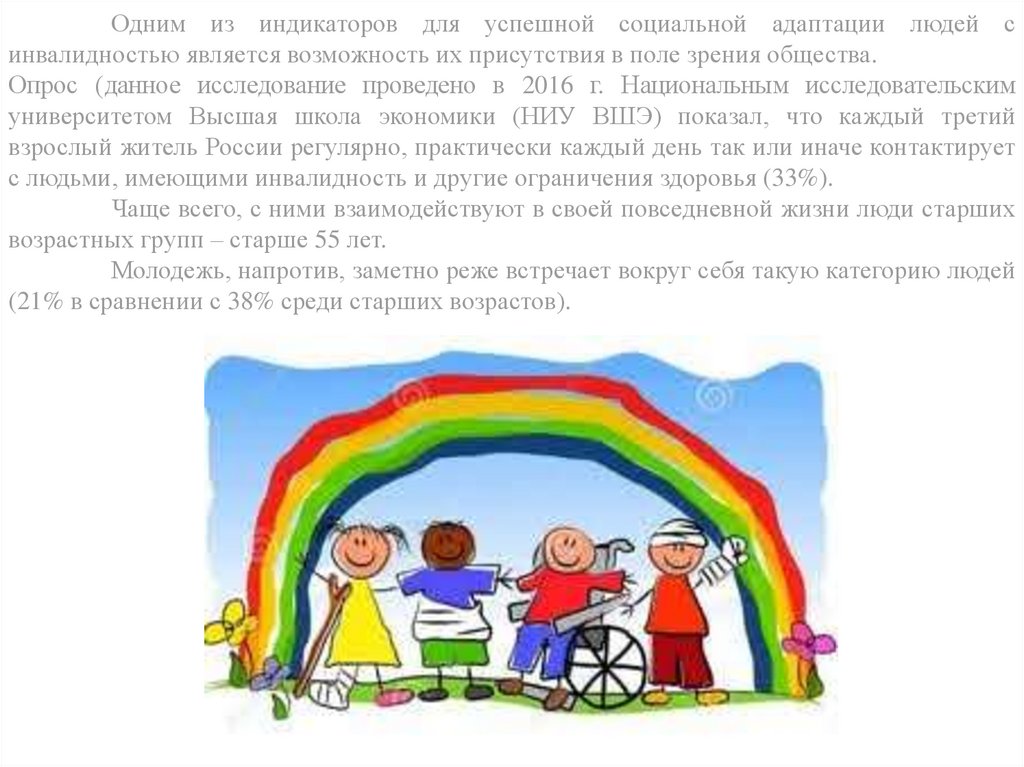 Одним из индикаторов для успешной социальной адаптации людей синвалидностью является возможность их присутствия в поле зрения общества.