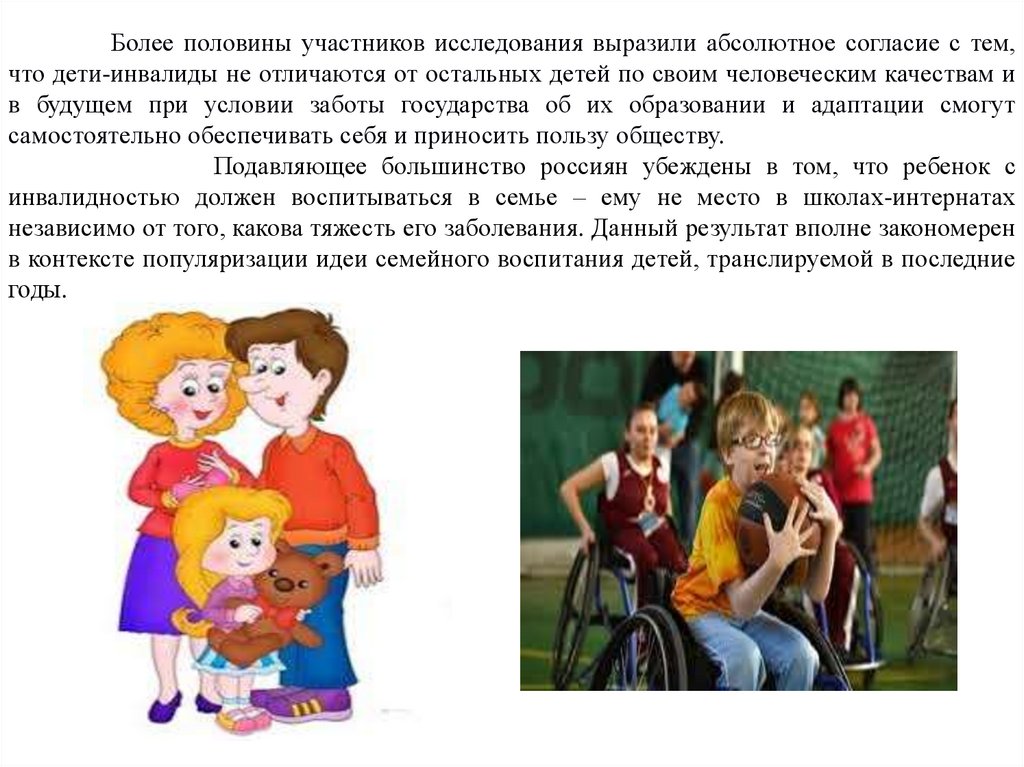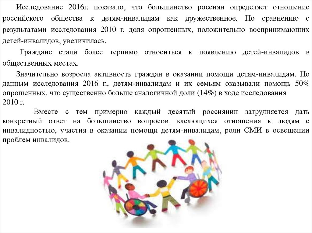 Исследование 2016г. показало, что большинство россиян определяет отношениероссийского общества к детям-инвалидам как дружественное. По сравнению с