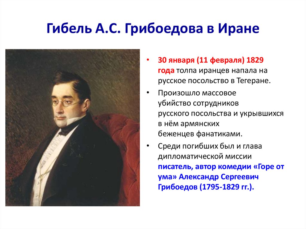 Гибель А.С. Грибоедова в Иране• 30 января (11 февраля) 1829