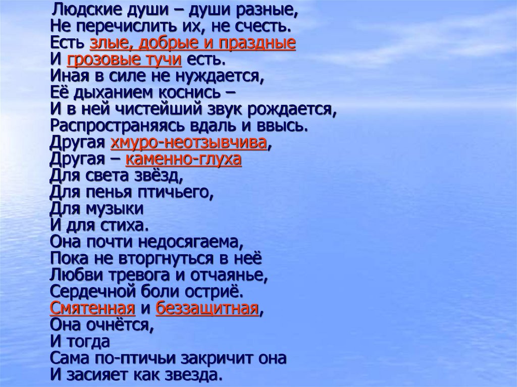 Людские души – души разные,Не перечислить их, не счесть.