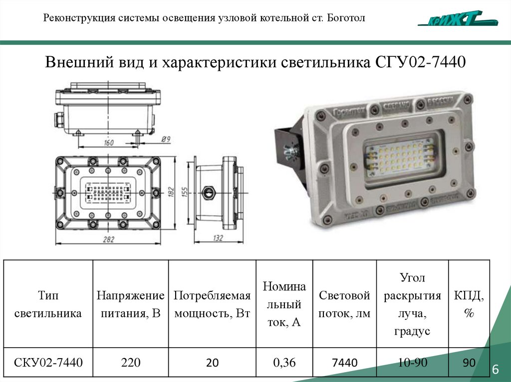Реконструкция системы освещения узловой котельной ст. БоготолВнешний вид и характеристики светильника СГУ02-7440