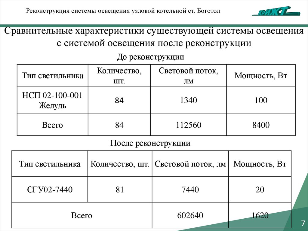 Реконструкция системы освещения узловой котельной ст. БоготолСравнительные характеристики существующей системы освещения