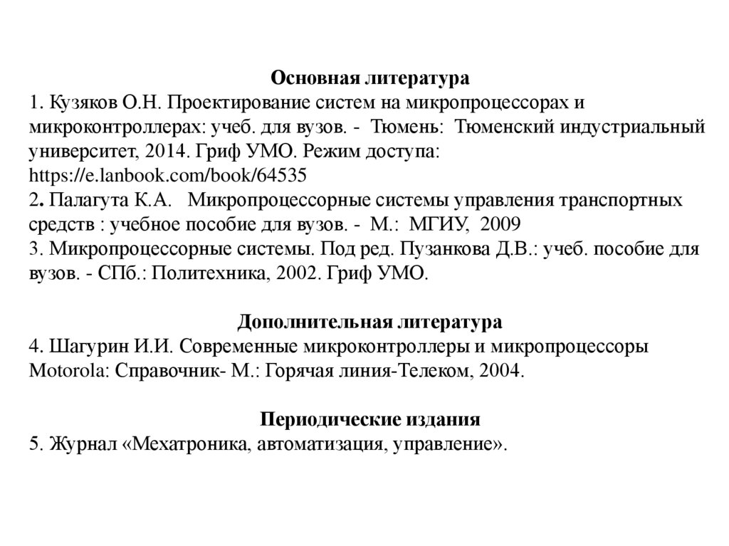 Основная литература1. Кузяков О.Н. Проектирование систем на микропроцессорах и