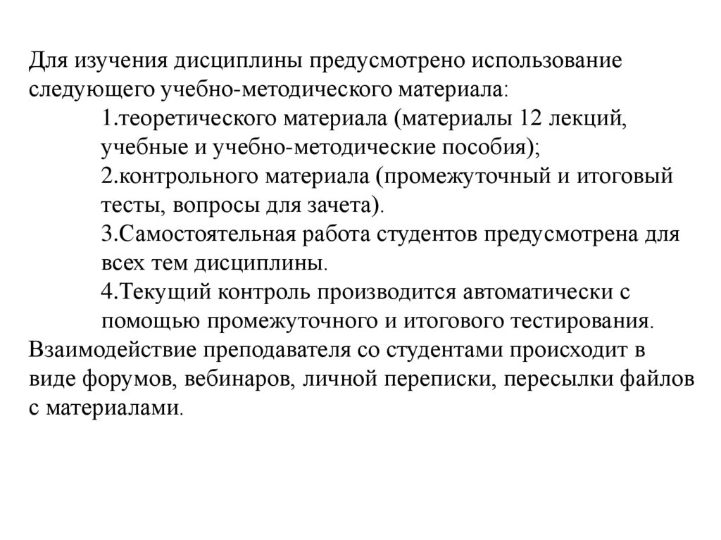 Для изучения дисциплины предусмотрено использованиеследующего учебно-методического материала: