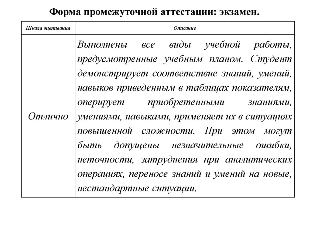 Форма промежуточной аттестации: экзамен.Шкала оценивания