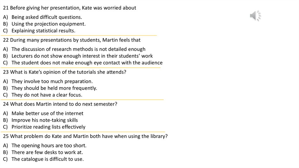 21 Before giving her presentation, Kate was worried aboutA) Being asked difficult questions.