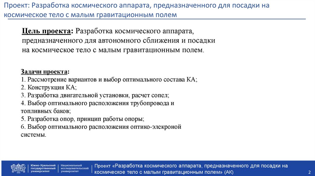 Название проекта: Разработка космического аппарата,предназначенного для посадки на космическое тело с малым