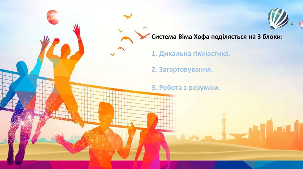 Система Віма Хофа поділяється на 3 блоки:1. Дихальна гімнастика.