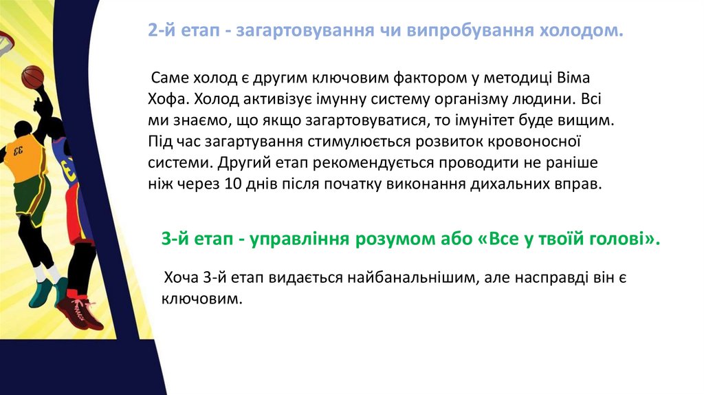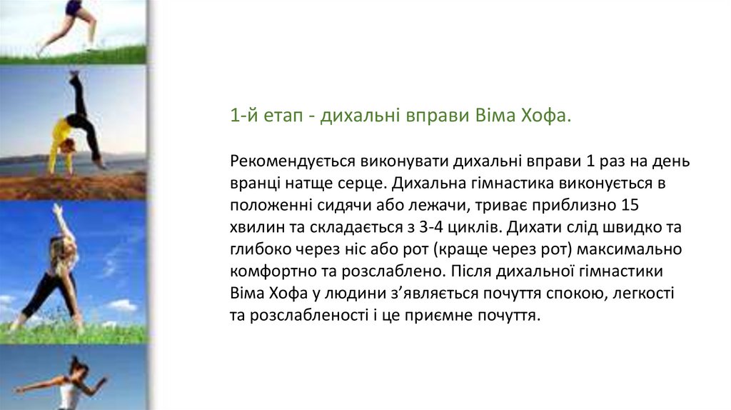 1-й етап - дихальні вправи Віма Хофа.Рекомендується виконувати дихальні вправи 1 раз на день