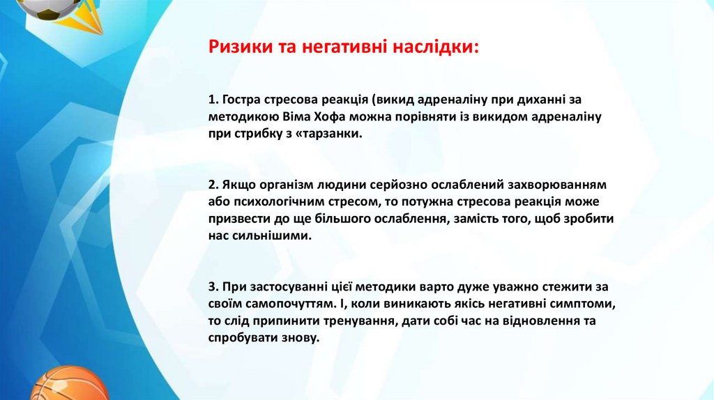 Ризики та негативні наслідки:1. Гостра стресова реакція (викид адреналіну при диханні за