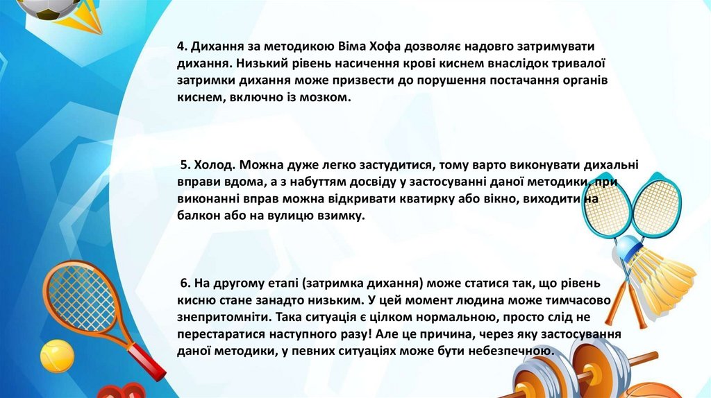 4. Дихання за методикою Віма Хофа дозволяє надовго затримуватидихання. Низький рівень насичення крові киснем внаслідок тривалої