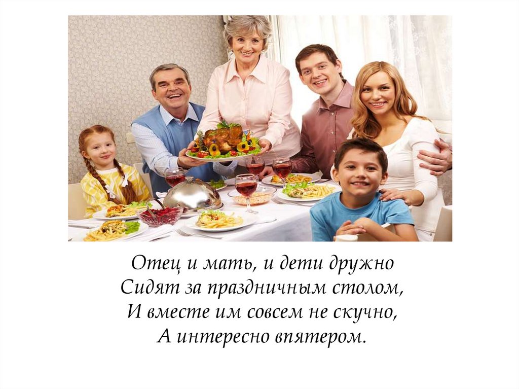 Отец и мать, и дети дружноСидят за праздничным столом,