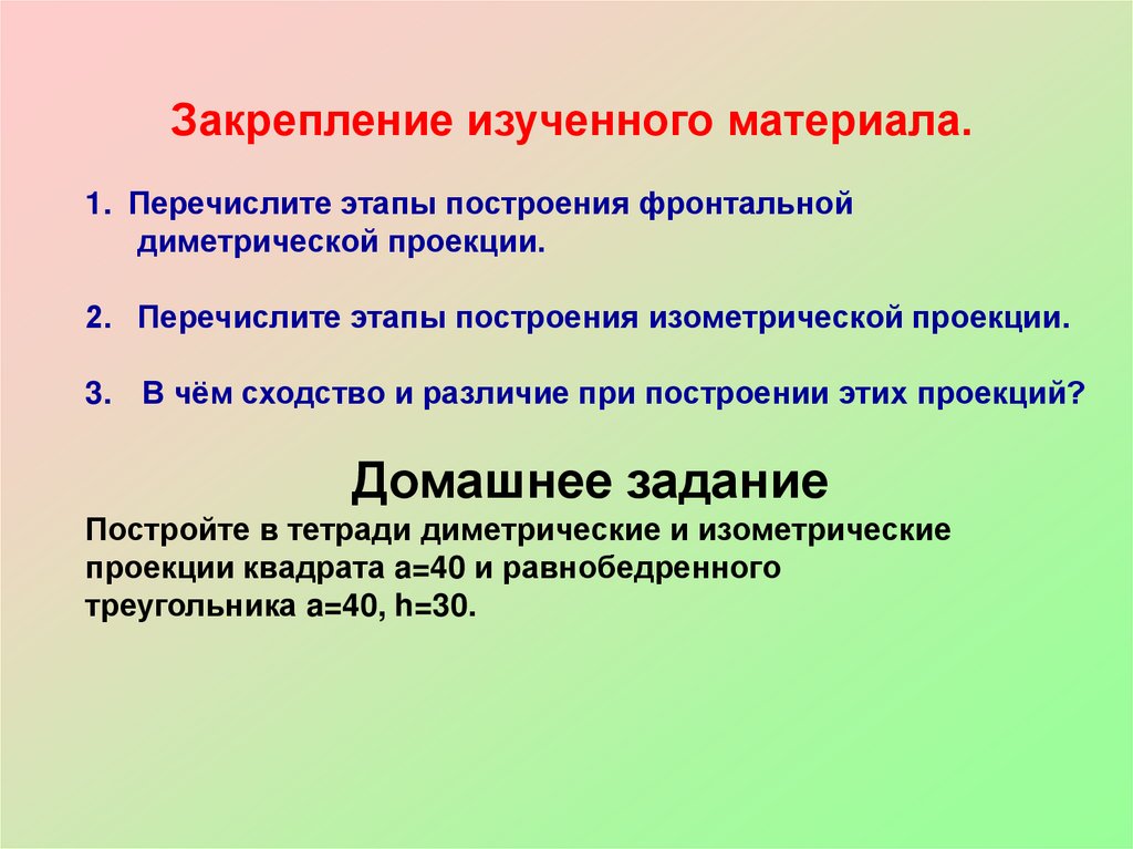 Закрепление изученного материала.1. Перечислите этапы построения фронтальной