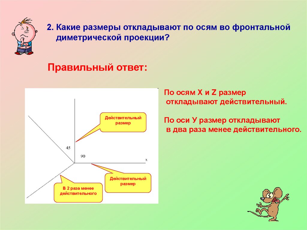 2. Какие размеры откладывают по осям во фронтальнойдиметрической проекции?