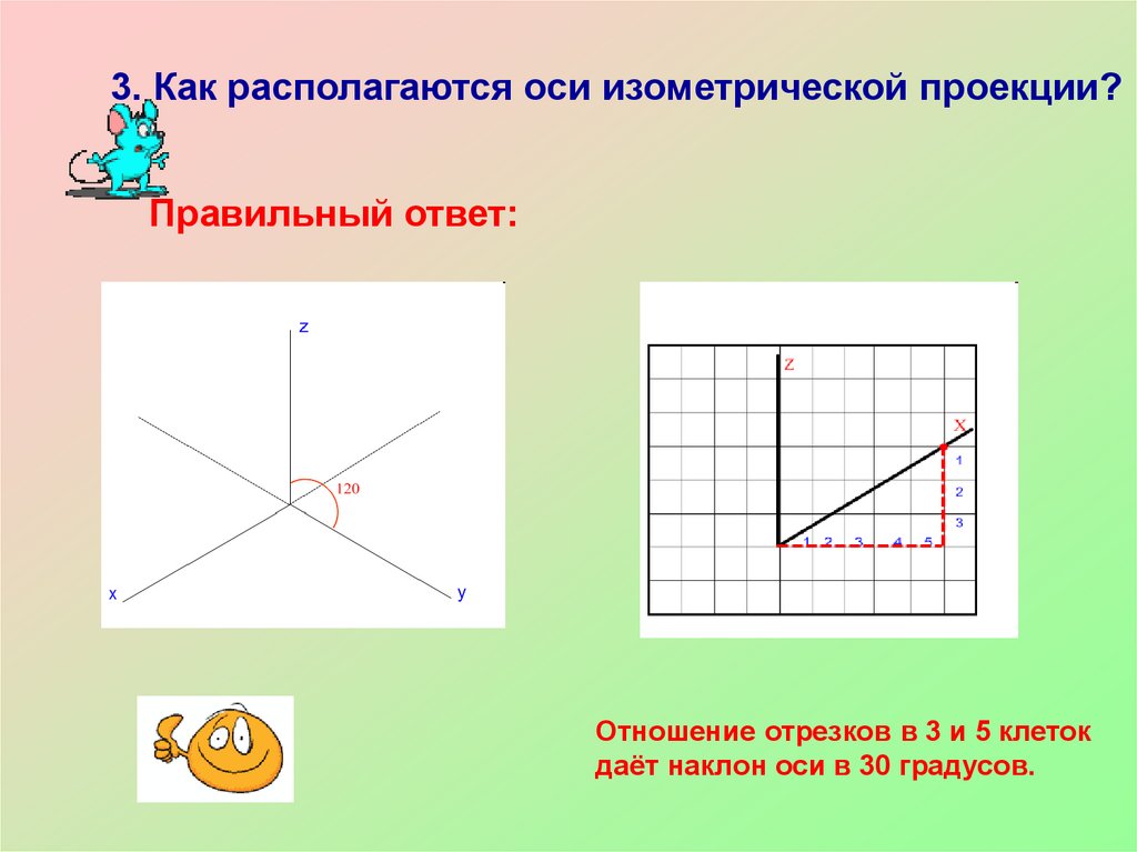 3. Как располагаются оси изометрической проекции?Правильный ответ: