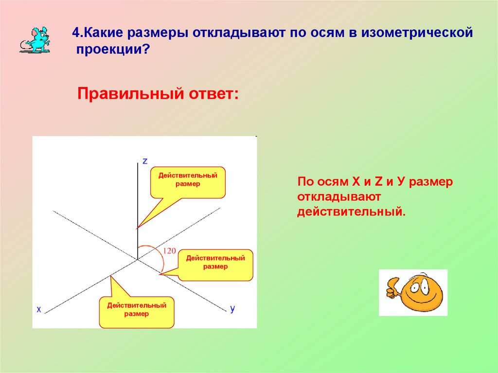 4.Какие размеры откладывают по осям в изометрическойпроекции?
